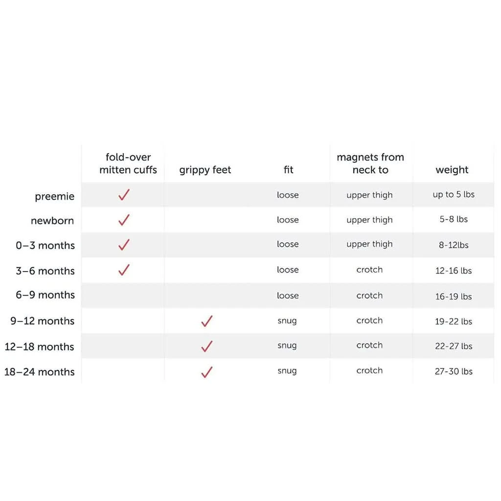 Featuring magnetic closures from neck to upper thigh for sizes up to 0-3 months and from neck to crotch for sizes 3-6 months and beyond, this footie provides the ultimate convenience for parents. The built-in mitten cuffs help prevent scratching for sizes up to 6 months, while the non-slip foot grips in sizes 9-12 months and up ensure safe, comfortable movement as your baby grows. Additionally, the footie is machine washable, making cleaning a breeze. With RightFit™ technology, the fit varies based on fabric type, allowing you to choose the perfect footie style for your baby’s needs. Magnetic Me ensures that every garment complies with fire safety guidelines, offering a safe and comfortable option for babies and toddlers alike.
