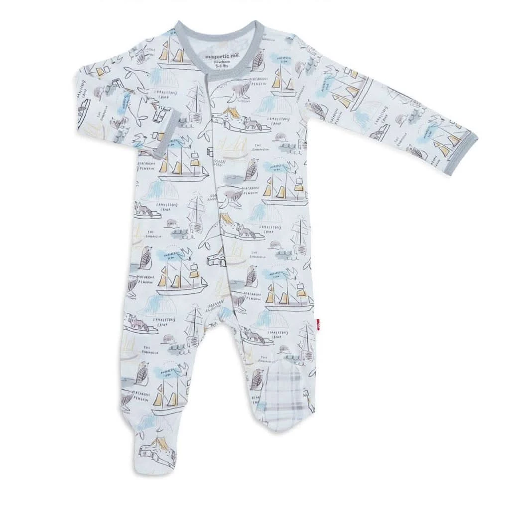 Magnetic Me Shakleton Modal Magnetic Footie is a soft, stylish all-day and all-night wardrobe staple with smart magnetic fasteners that makes changing time painless. With no over-the-head design, simply open the outfit, insert baby, and BOOM, DONE! – the footie practically closes itself. Machine wash as directed.