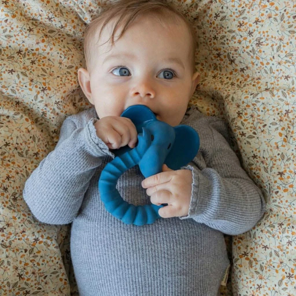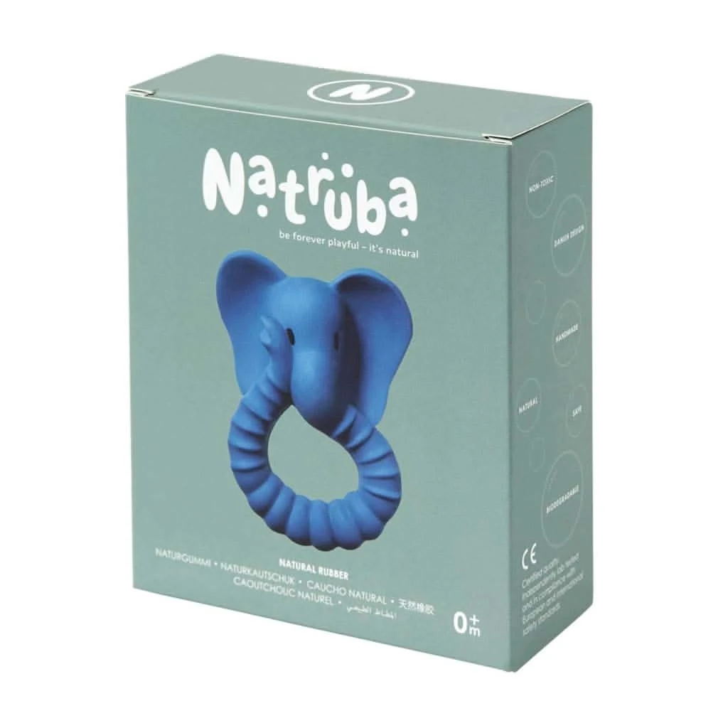 Natruba Elephant Teether, Blue. Textured trunk, air filled head, solid beads, silk-like surface touch.