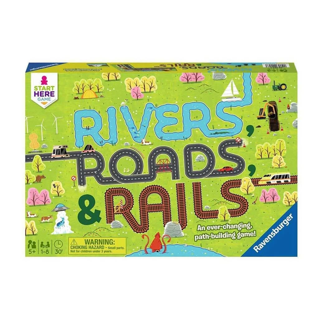 Rivers, Roads & Rails is a transportation-themed card matching game that puts kids in the driver’s seat. Players build an ever-changing transportation network that includes rivers, roads and railroad tracks on which ships, cars and trains can move freely. Each card must connect perfectly to the next, providing the proper pathway for the vehicles to travel. In Rivers, Roads & Rails, players build an intricate transportation network for boats, cars and trains. The pathway cards must match precisely, and the first player to use up all of their cards wins. What’s In The Box? 140 illustrated scenery cards, 1 set of instructions.